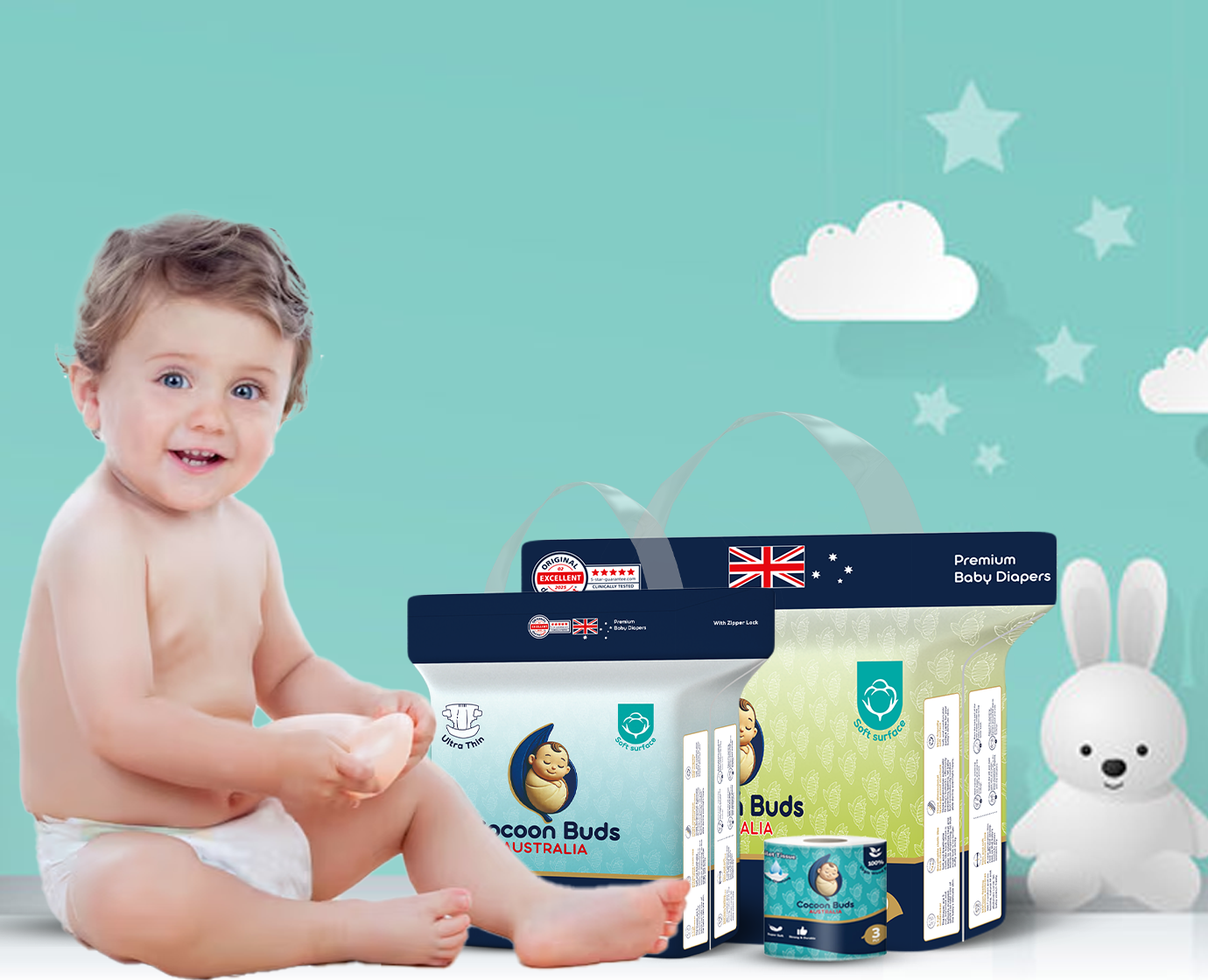 Cocoon Buds diapers are crafted with ultra-soft, Australian-standard materials and advanced absorption technology. They provide long-lasting dryness, gentle comfort, and hypoallergenic protection—perfect for sensitive baby skin.